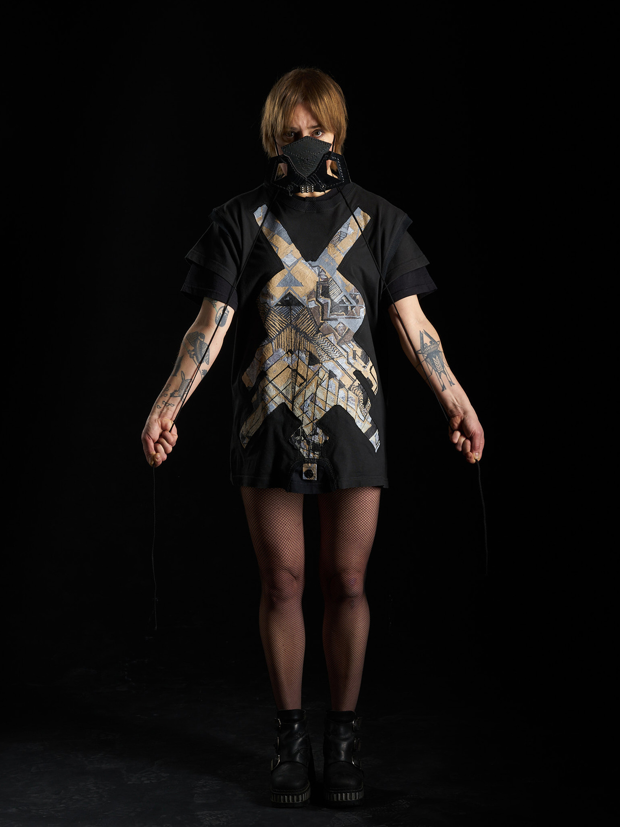 2023 A collage of cut-out stencils, hand-stitched seams, and layered textures. Eighteen recycled black T-shirts and three textile paintings were dismantled, split apart, and reassembled into nine sculptural garments. The patchwork surfaces reveal traces of their previous lives—stitched scars, painted fragments, shifting shapes — an exploration of deconstruction, transformation, and rebirth.